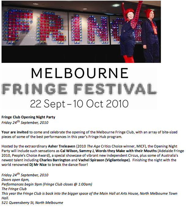 Here is the video footage of the Fringe Hub 2010, an incredible production design from the team at Melbourne Fringe,